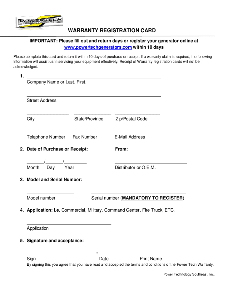 WARRANTY REGISTRATION CARD IMPORTANT: Please fill out and return days or register your generator online at www.powertechgenerators.com within 10 days Please complete this card and return it within