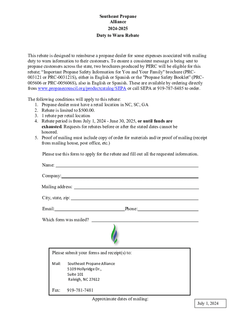 Southeast Propane Alliance 20242025 Duty to Warn RebateThis rebate is designed to reimburse a propane dealer for some expenses associated with mailing duty to warn information to their customers.