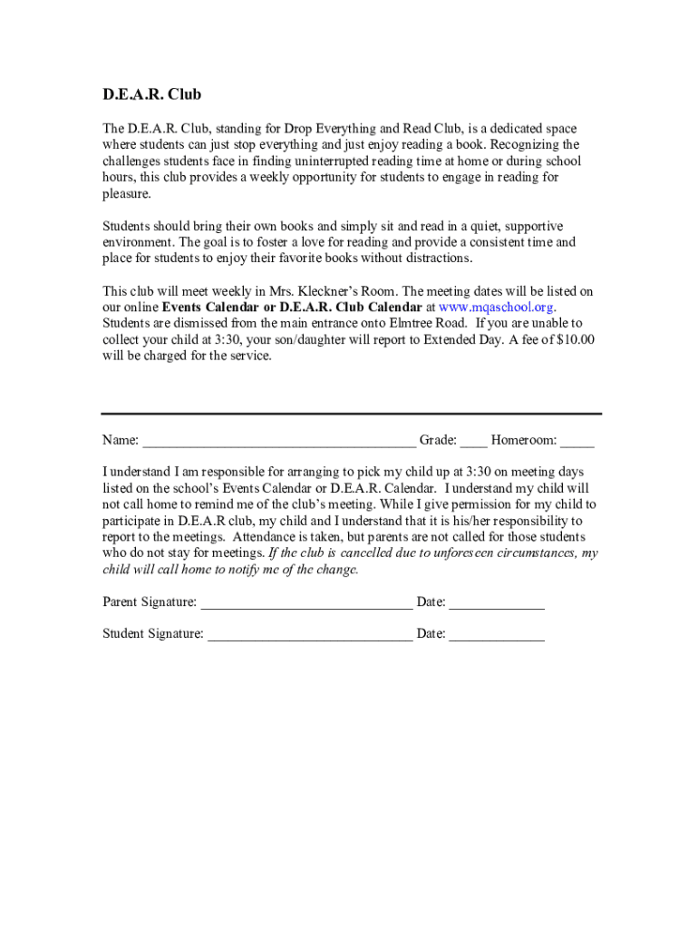 D.E.A.R. Club The D.E.A.R. Club, standing for Drop Everything and Read Club, is a dedicated space where students can just stop everything and just enjoy reading a book. Recognizing the challenges