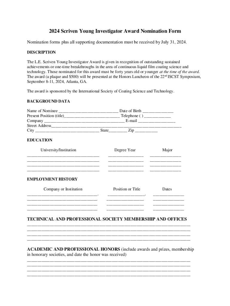 2024 Scriven Young Investigator Award Nomination Form Nomination forms plus all supporting documentation must be received by July 31, 2024. DESCRIPTION The L.E. Scriven Young Investigator Award is