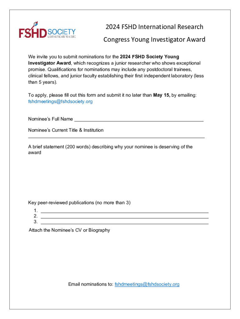 2024 FSH International Research Congress Young Investigator Award We invite you to submit nominations for the 2024 FSH Society Young Investigator Award, which recognizes a junior researcher who shows