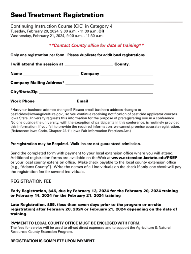 Seed Treatment Registration Continuing Instruction Course (CIC) in Category 4 Tuesday, February 20, 2024, 9:00 a.m. 11:30 a.m. OR Wednesday, February 21, 2024, 9:00 a.m. 11:30 a.m.**Contact County