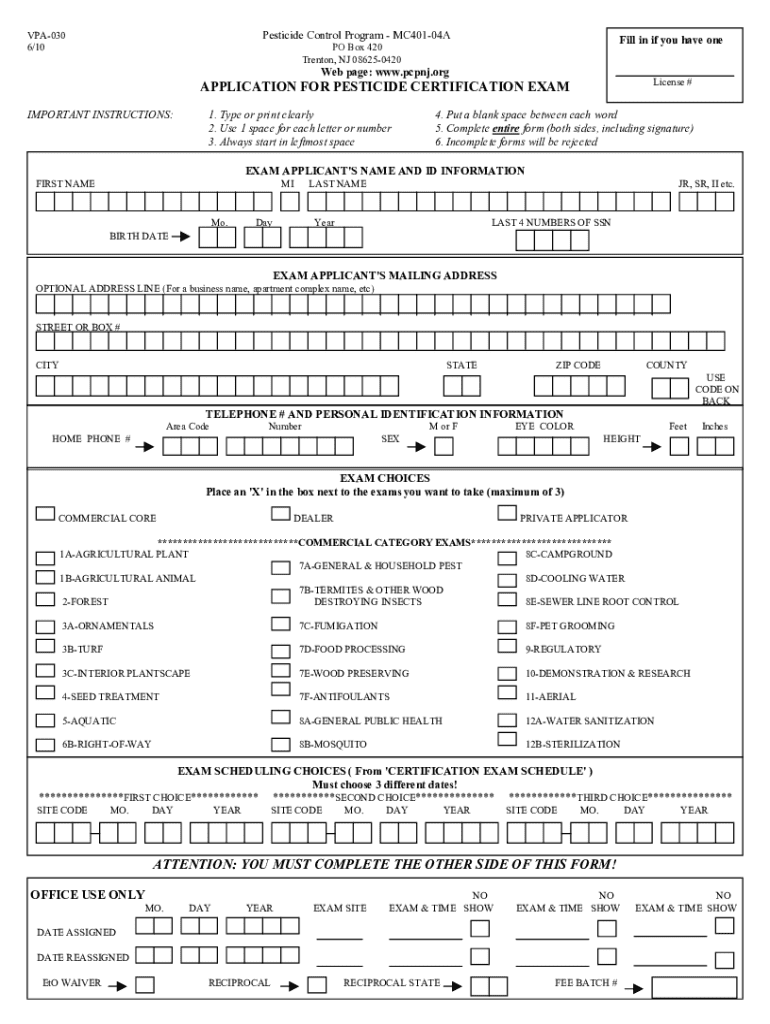 Pesticide Control Program MC40104AVPA030 6/10Fill in if you have onePO Box 420 Trenton, NJ 086250420Web page: www.pcpnj.orgLicense #APPLICATION FOR PESTICIDE CERTIFICATION EXAM IMPORTANT INSTRUCTIONS:1.