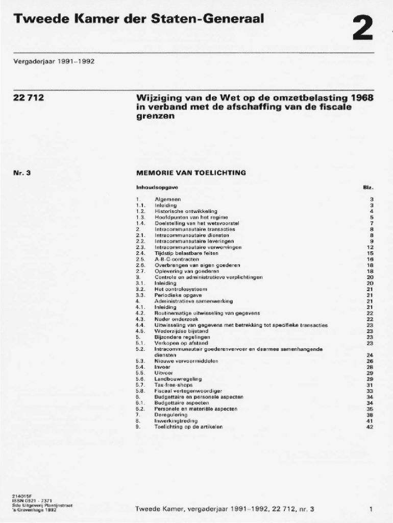 Tweede Kamer der StatenGeneraal2Vergaderjaar 1991199222712Wijziging van de Wet op de omzetbelasting 1968 in verband met de afschaffing van de fiscale grenzenNr. 3MEMORIE VAN TOELICHTING Inhoudsopgave