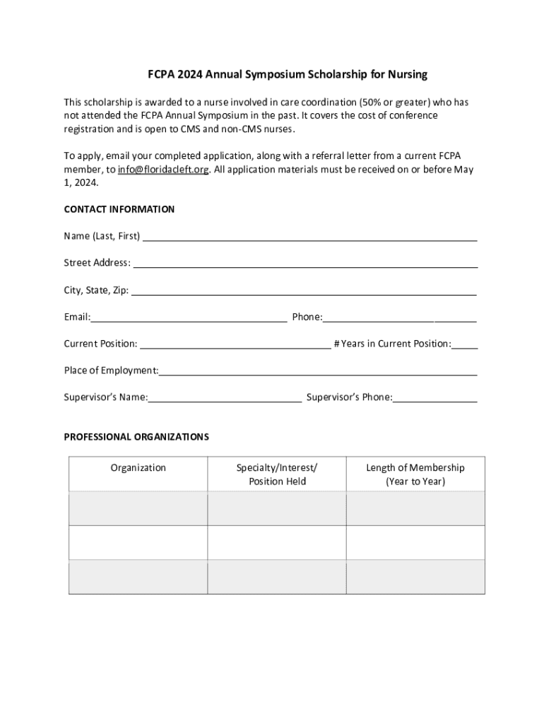 FCPA 2024 Annual Symposium Scholarship for Nursing This scholarship is awarded to a nurse involved in care coordination (50% or greater) who has not attended the FCPA Annual Symposium in the past.