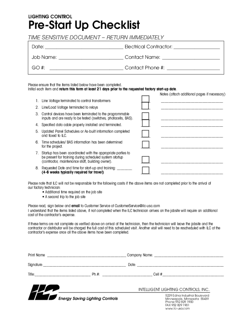LIGHTING CONTROLPreStart Up Checklist TIME SENSITIVE DOCUMENT RETURN IMMEDIATELY Date: ___ Electrical Contractor: ___ Job Name: ___ Contact Name: ___ GO #: ___ Contact Phone #: ___Please ensure that