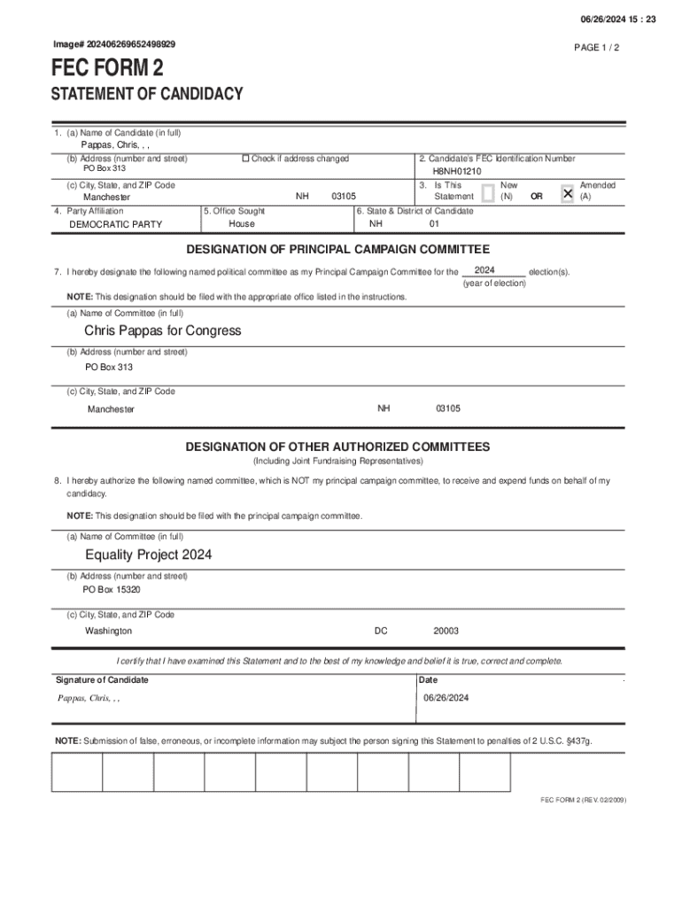06/26/2024 15 : 23 Image# 202406269652498929PAGE 1 / 2FEC FORM 2 STATEMENT OF CANDIDACY 1. (a) Name of Candidate (in full) Pappas, Chris, , , (b) Address (number and street)Check if address changed2.