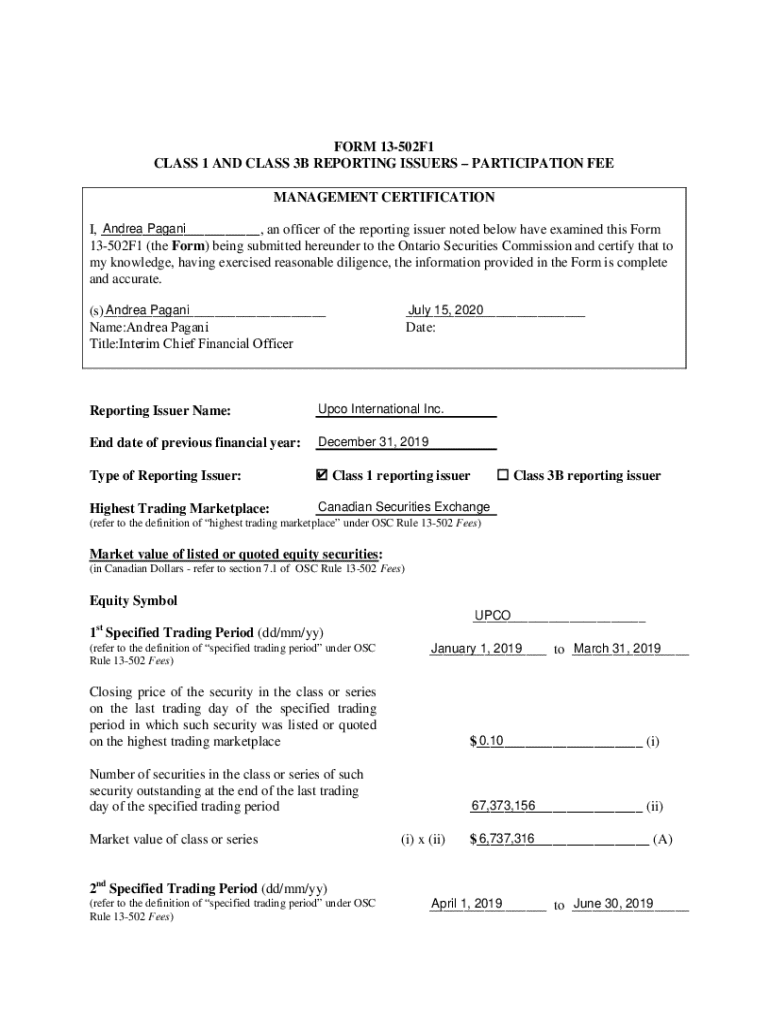 FORM 13502F1 CLASS 1 AND CLASS 3B REPORTING ISSUERS PARTICIPATION FEE MANAGEMENT CERTIFICATION Andrea Pagani I, ___, an officer of the reporting issuer noted below have examined this Form 13502F1