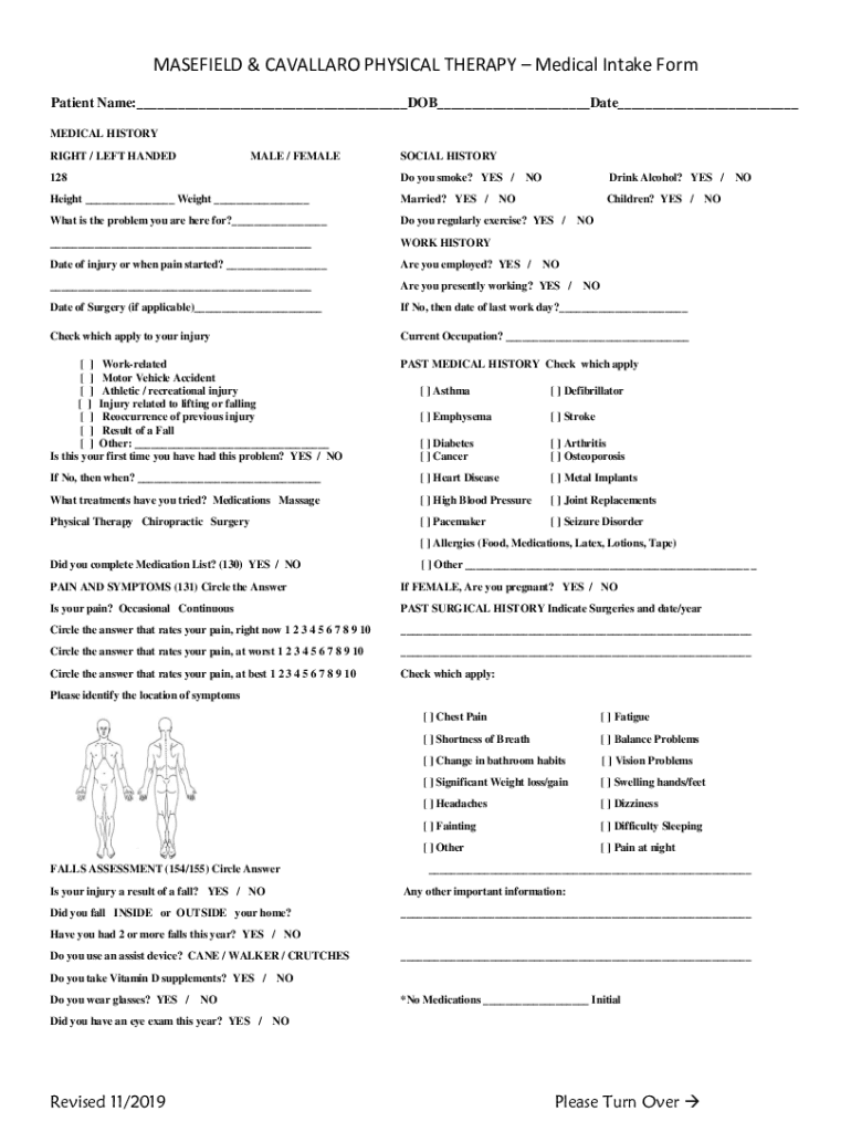 MASEFIELD & CAVALLARO PHYSICAL THERAPY Medical Intake Form Patient Name:___DOB___Date___ MEDICAL HISTORY RIGHT / LEFT HANDEDMALE / FEMALESOCIAL HISTORY128Do you smoke? YES / NODrink Alcohol? YES /Height