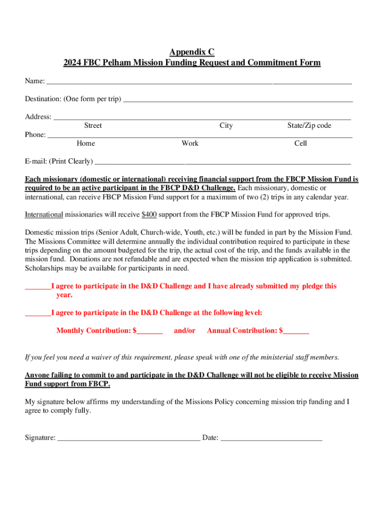 Appendix C 2024 BBC Pelham Mission Funding Request and Commitment Form Name: ___ Destination: (One form per trip) ___ Address: ___ Street City State/Zip code Phone: ___ Homework Cell Email: (Print