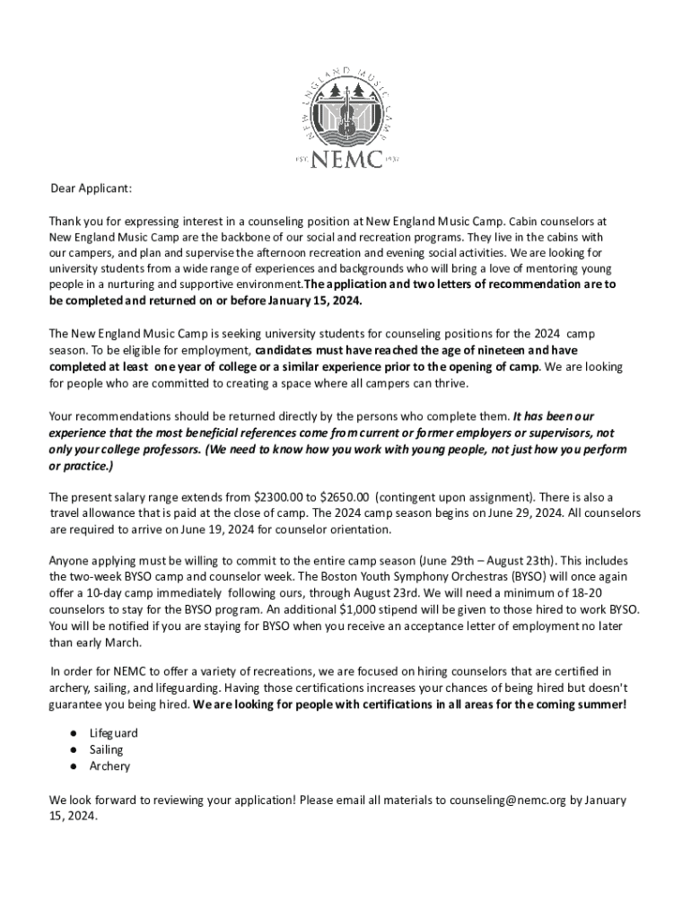 Dear Applicant: Thank you for expressing interest in a counseling position at New England Music Camp. Cabin counselors at New England Music Camp are the backbone of our social and recreation programs.