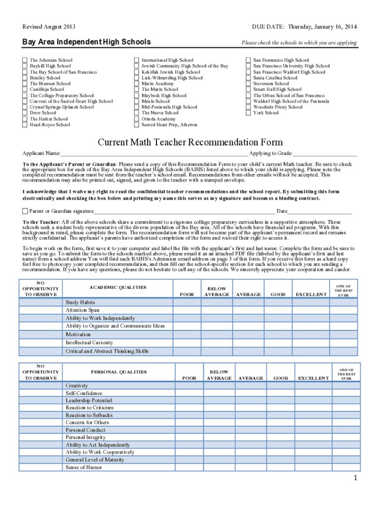 Revised August 2013DUE DATE: Thursday, January 16, 2014Bay Area Independent High Schools ! The Athenian School Bayhill High School The Bay School of San Francisco Bentley School The Branson School