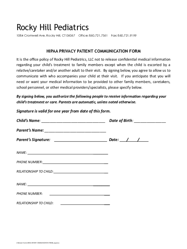 Rocky Hill Pediatrics 1084 Cromwell Ave. Rocky Hill, CT 06067Office: 860.721.7561Fax: 860.721.9199HIPAA PRIVACY PATIENT COMMUNICATION FORM It is the oce policy of Rocky Hill Pediatrics, LLC not to