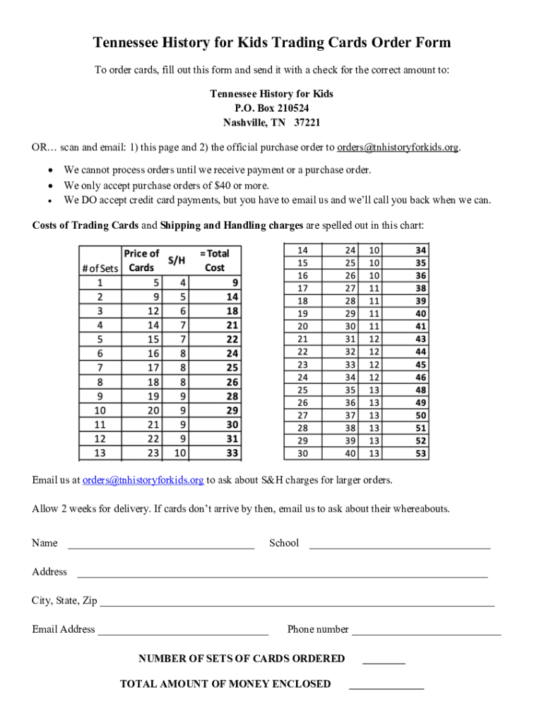 Tennessee History for Kids Trading Cards Order Form To order cards, fill out this form and send it with a check for the correct amount to: Tennessee History for Kids P.O. Box 210524 Nashville, TN