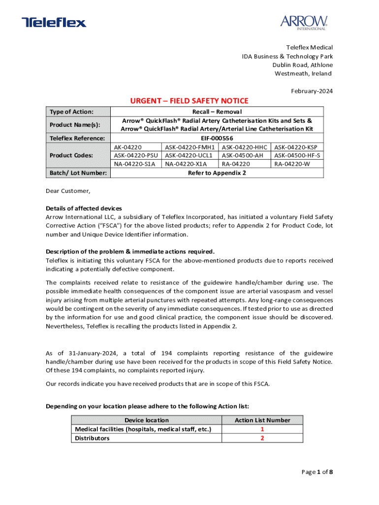 Telefax Medical IDA Business & Technology Park Dublin Road, Alone Vestments, Ireland February2024URGENT FIELD SAFETY NOTICE Type of Action:Recall Removal Arrow Newsflash Radial Artery Catheterization
