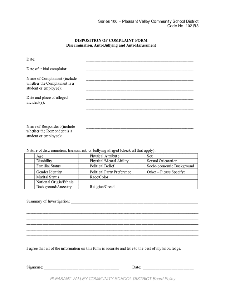 Series 100 Pleasant Valley Community School District Code No. 102.R3 DISPOSITION OF COMPLAINT FORM Discrimination, AntiBullying and AntiHarassment Date:___Date of initial complaint:___Name of Complainant