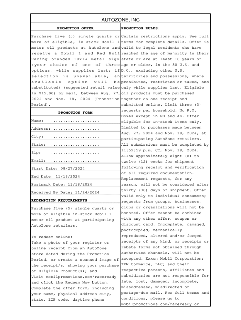 AUTOZONE, INC PROMOTION OFFERPROMOTION RULES:Purchase five (5) single quarts or Certain restrictions apply. See full more of eligible, instock Mobil 1 terms for complete details. Offer is motor oil