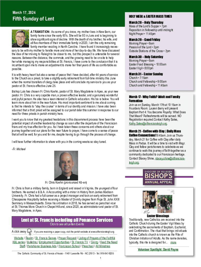 March 17, 2024HOLY WEEK & EASTER MASS TIMESFifth Sunday of Lent A TRANSITION: As some of you know, my mother lives in New Bern, our family home since the early 60s. She will be 93 in June and is beginning