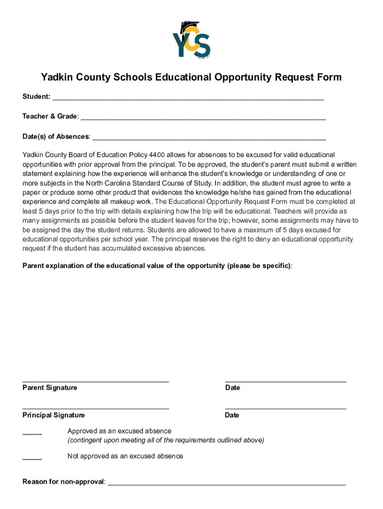 Yadkin County Schools Educational Opportunity Request Form Student: ___ Teacher & Grade: ___ Date(s) of Absences: ___ Yadkin County Board of Education Policy 4400 allows for absences to be excused