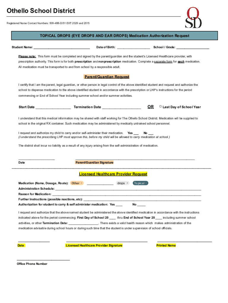 Othello School District Registered Nurse Contact Numbers: 5094883351 EXT 2029 and 2015TOPICAL DROPS (EYE DROPS AND EAR DROPS) Medication Authorization Request Student Name: ___Date of Birth: ___School