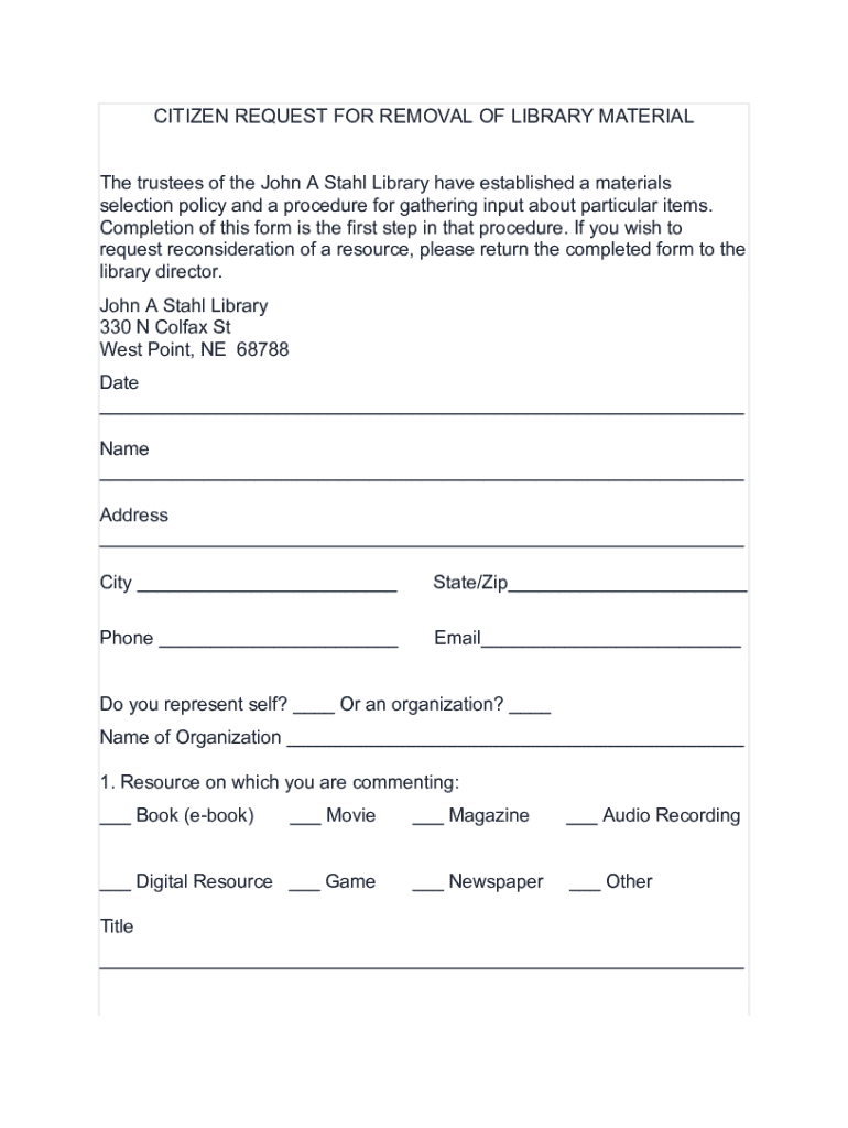 CITIZEN REQUEST FOR REMOVAL OF LIBRARY MATERIAL The trustees of the John A Stahl Library have established a materials selection policy and a procedure for gathering input about particular items. Completion