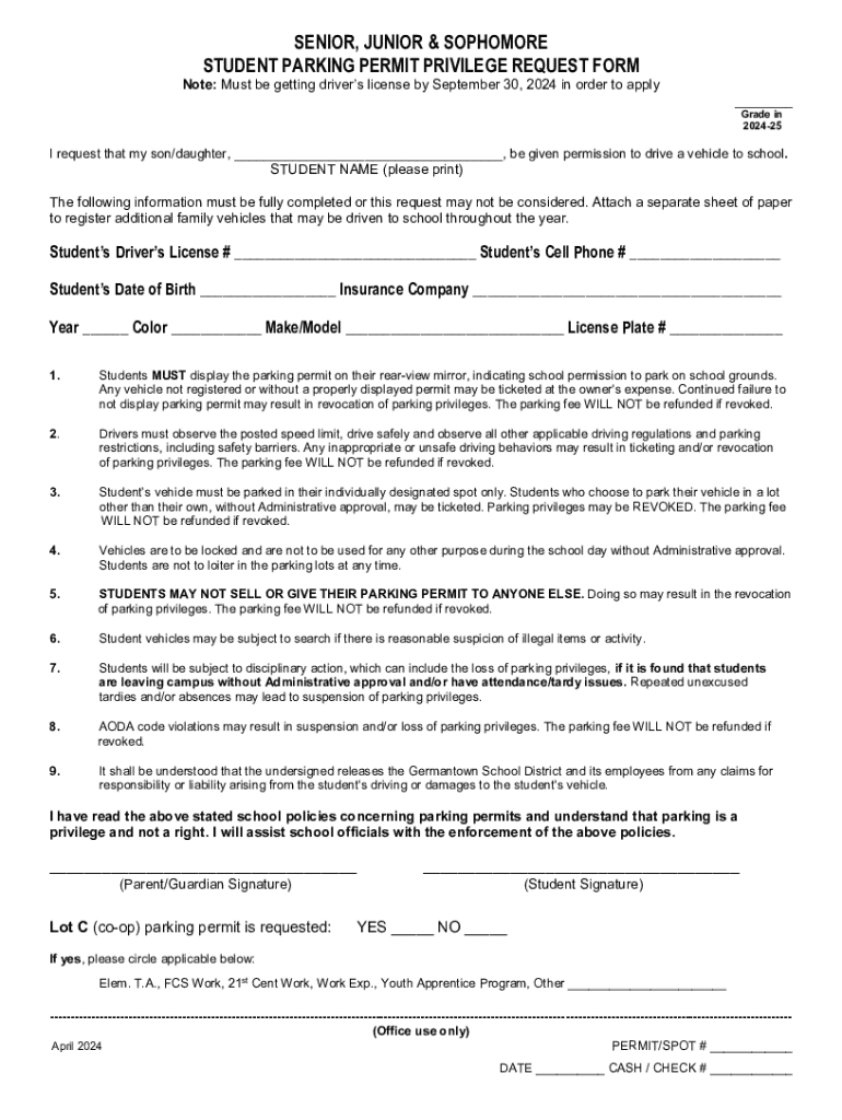 SENIOR, JUNIOR & SOPHOMORE STUDENT PARKING PERMIT PRIVILEGE REQUEST FORM Note: Must be getting drivers license by September 30, 2024 in order to apply ___ Grade in 202425I request that my son/daughter,