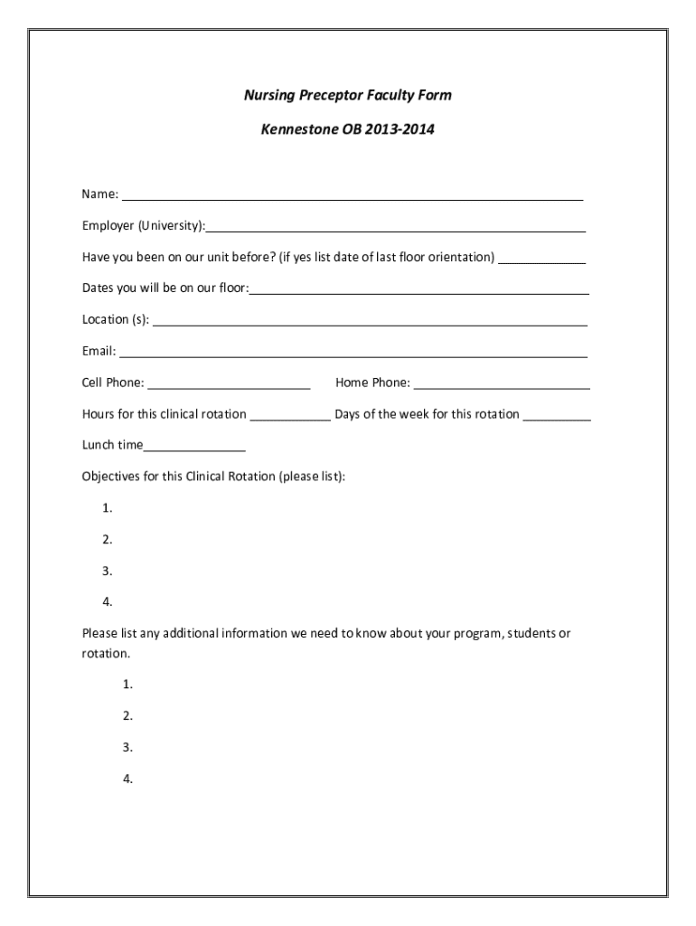 Nursing Preceptor Faculty Form Kennestone OB 20132014Name: ___ Employer (University):___ Have you been on our unit before? (if yes list date of last floor orientation) ___ Dates you will be on our