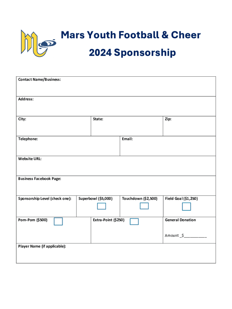Mars Youth Football & Cheer 2024 Sponsorship Contact Name/Business:Address:City:State:Telephone:Zip:Email:Website URL:Business Facebook Page:Sponsorship Level (check one):PomPom ($500)Superbowl ($5,000)Touchdown