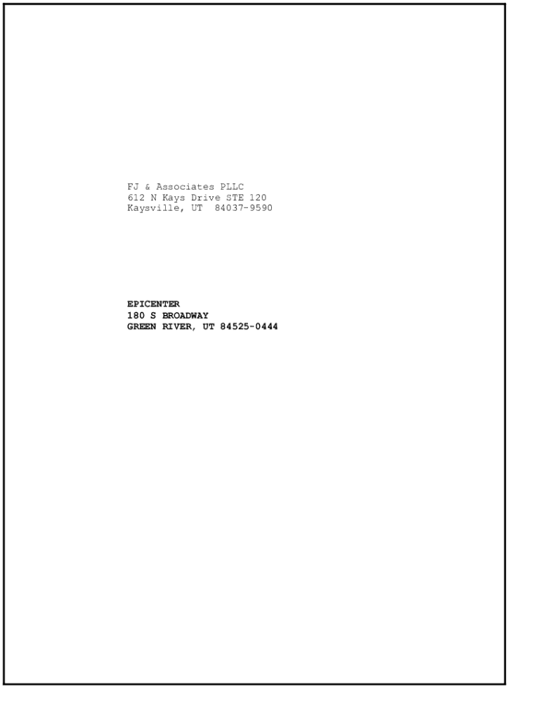 FJ & Associates PLLC 612 N Kays Drive STE 120 Kaysville, UT 840379590EPICENTER 180 S BROADWAY GREEN RIVER, UT 845250444FJ & Associates PLLC 612 N Kays Drive STE 120 Kaysville, UT 840379590 8019271337