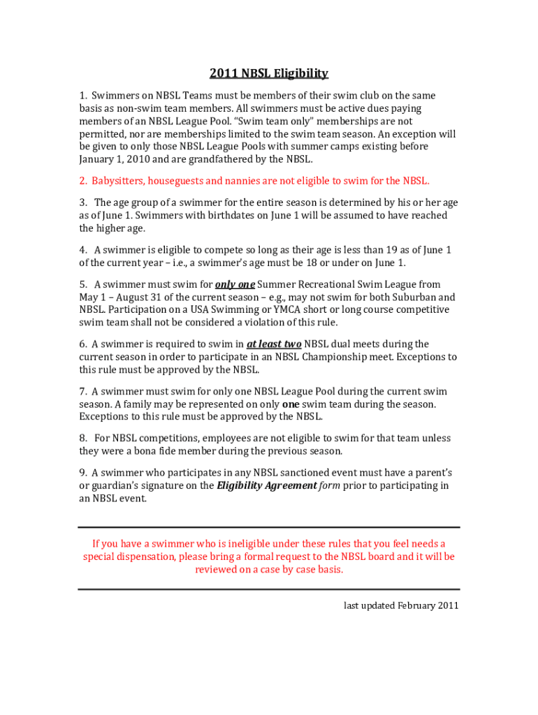 Get the free NBSL Eligibility 1. Swimmers on NBSL Teams must be ...