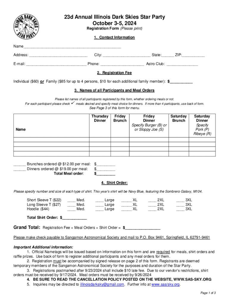 23d Annual Illinois Dark Skies Star Party October 35, 2024 Registration Form (Please print) 1. Contact Information Name___ Address: ___City: ___ State:___ ZIP:___Email: ___ Phone: ___ Astro Club: