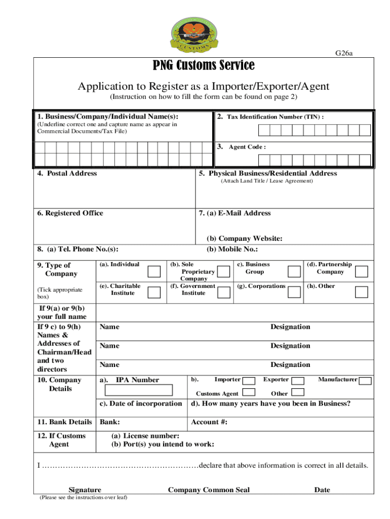 G26aPNG Customs Service Application to Register as a Importer/Exporter/Agent (Instruction on how to fill the form can be found on page 2) 1. Business/Company/Individual Name(s):2. Tax Identification