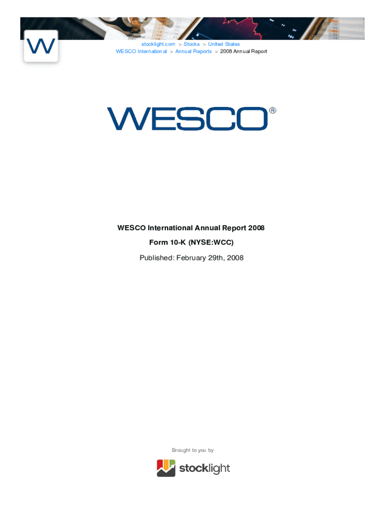 Stocklight.com Stocks United States WE SCO International Annual Reports 2008 Annual ReportWESCO International Annual Report 2008 Form 10K (NYSE:WCC) Published: February 29th, 2008Brought to you UNESCO