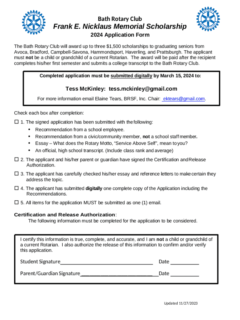 Bath Rotary ClubFrank E. Nicklaus Memorial Scholarship 2024 Application Form The Bath Rotary Club will award up to three $1,500 scholarships to graduating seniors from Avoca, Bradford, CampbellSavona,