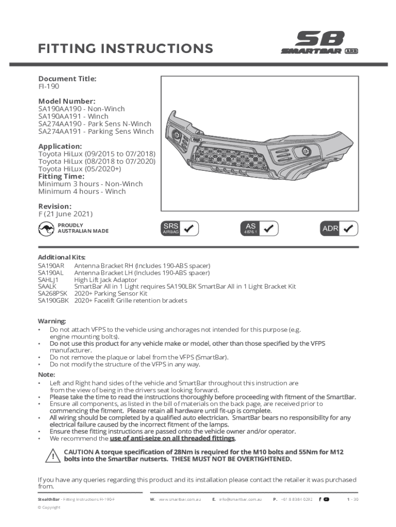 FITTING INSTRUCTIONS Document Title: FI190 Model Number: SA190AA190 NonWinch SA190AA191 Winch SA274AA190 Park Sens NWinch SA274AA191 Parking Sens Winch Application: Toyota HiLux (09/2015 to 07/2018)