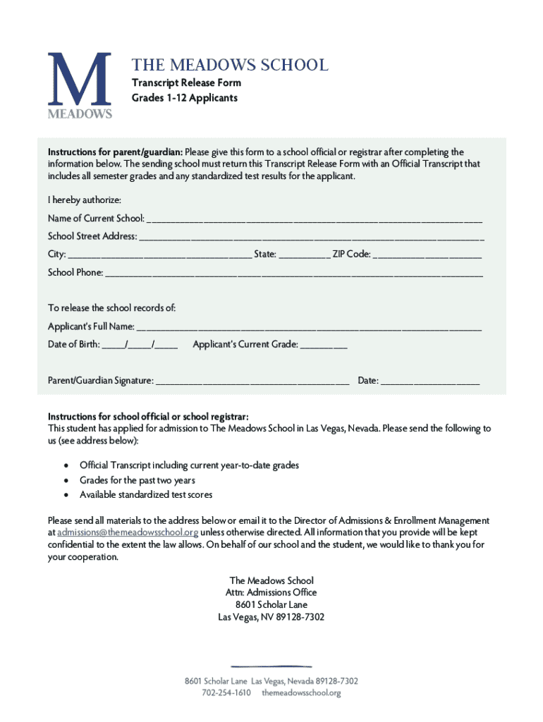 THE MEADOWS SCHOOL Transcript Release Form Grades 112 ApplicantsInstructions for parent/guardian: Please give this form to a school official or registrar after completing the information below. The