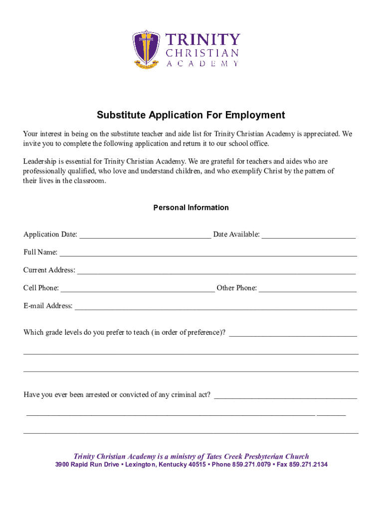 Substitute Application For Employment Your interest in being on the substitute teacher and aide list for Trinity Christian Academy is appreciated. We invite you to complete the following application