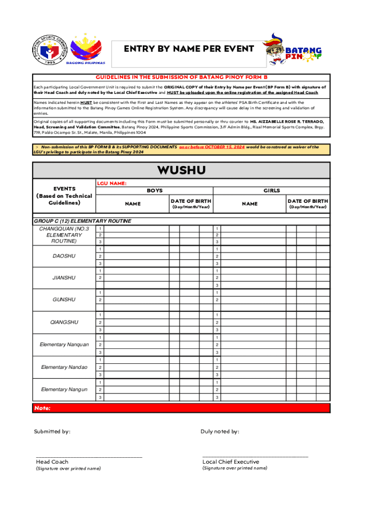 ENTRY BY NAME PER EVENT GUIDELINES IN THE SUBMISSION OF BATANG PINOY FORM B Each participating Local Government Unit is required to submit the ORIGINAL COPY of their Entry by Name per Event (BP Form
