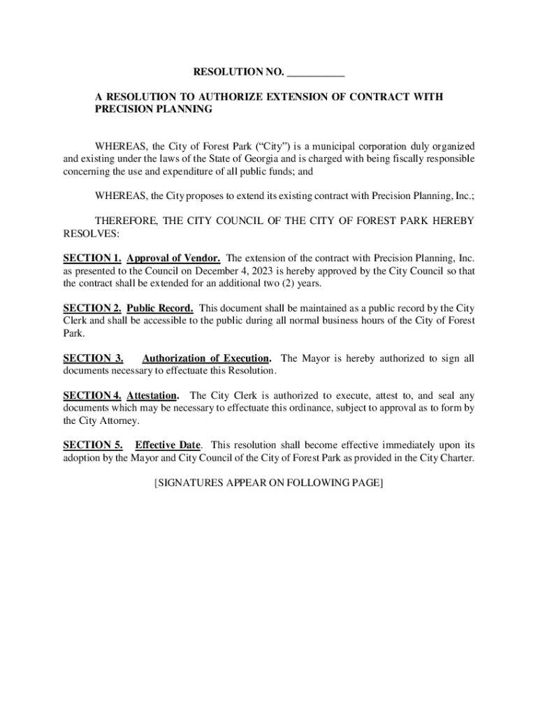 RESOLUTION NO. ___ A RESOLUTION TO AUTHORIZE EXTENSION OF CONTRACT WITH PRECISION PLANNING WHEREAS, the City of Forest Park (City) is a municipal corporation duly organized and existing under the