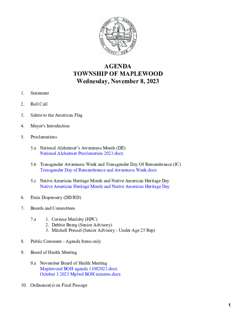 AGENDA TOWNSHIP OF MAPLEWOOD Wednesday, November 8, 2023 1.Statement2.Roll Call3.Salute to the American Flag4.Mayor\'s Introduction5.Proclamations 5.a National Alzheimers Awareness Month (DE) National