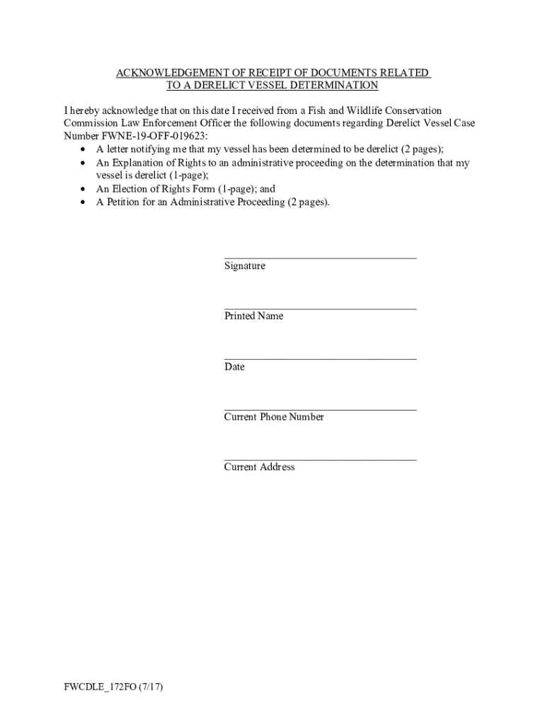 ACKNOWLEDGEMENT OF RECEIPT OF DOCUMENTS RELATED TO A DERELICT VESSEL DETERMINATION I hereby acknowledge that on this date I received from a Fish and Wildlife Conservation Commission Law Enforcement