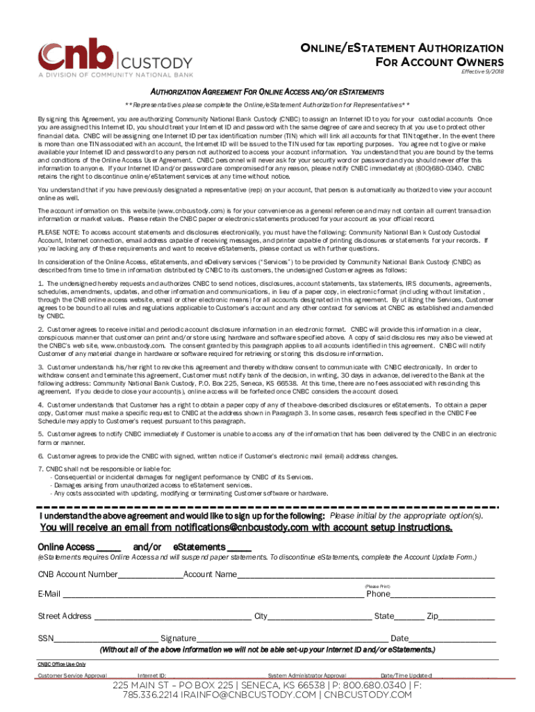 ONLINE/ESTATEMENT AUTHORIZATION FOR ACCOUNT OWNERS Effective 9/2018AUTHORIZATION AGREEMENT FOR ONLINE ACCESS AND/ OR ESTATEMENTS **Representatives please complete the Online/eStatement Authorization