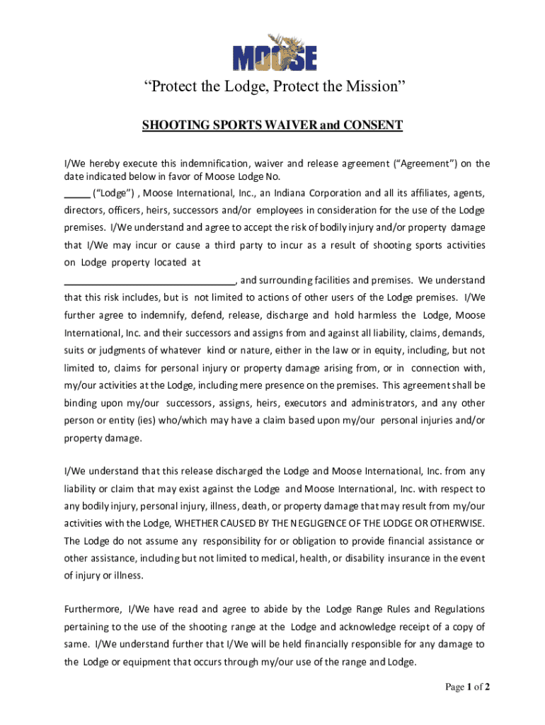 Protect the Lodge, Protect the Mission SHOOTING SPORTS WAIVER and CONSENT I/We hereby execute this indemnification, waiver and release agreement (Agreement) on the date indicated below in favor of