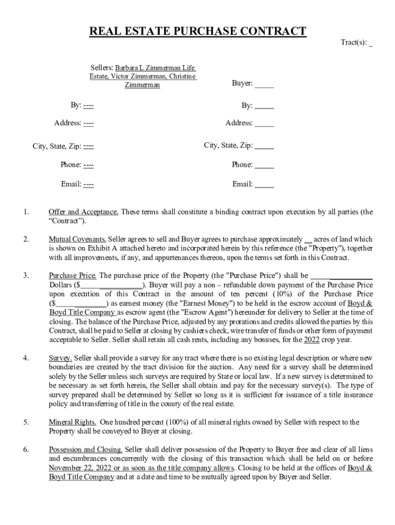 REAL ESTATE PURCHASE CONTRACT Tract(s): _ Sellers: Barbara L Zimmerman Life Estate, Victor Zimmerman, Christine ZimmermanBuyer:By: By By:Address: Address:City, State, Zip: City, State, Zip:Phone: