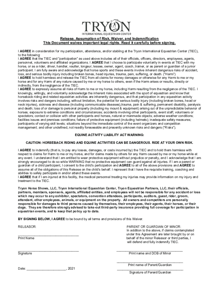 Release, Assumption of Risk, Waiver, and Indemnification This Document waives important legal rights. Read it carefully before signing. I AGREE in consideration for my participation, attendance, and/or