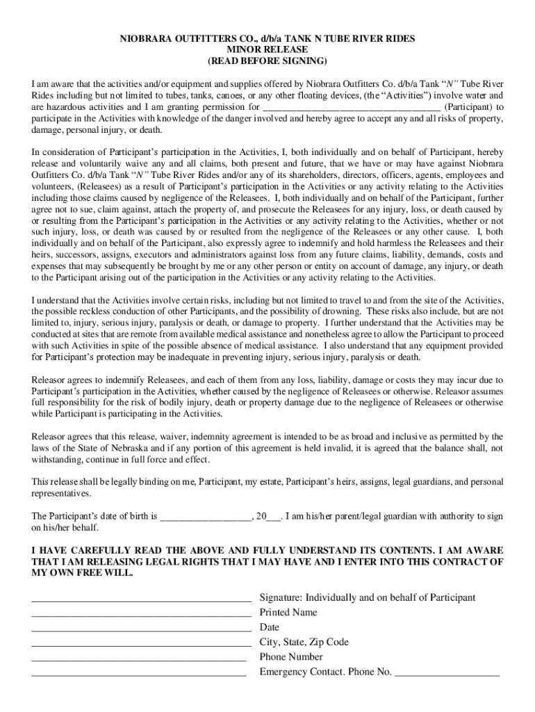 NIOBRARA OUTFITTERS CO., d/b/a TANK N TUBE RIVER RIDES MINOR RELEASE (READ BEFORE SIGNING) I am aware that the activities and/or equipment and supplies offered by Niobrara Outfitters Co. d/b/a Tank