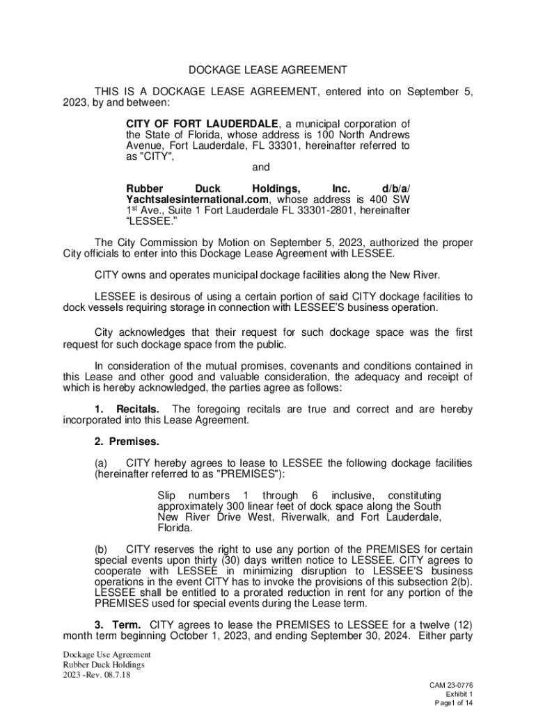DOCKAGE LEASE AGREEMENT THIS IS A DOCKAGE LEASE AGREEMENT, entered into on September 5, 2023, by and between: CITY OF FORT LAUDERDALE, a municipal corporation of the State of Florida, whose address