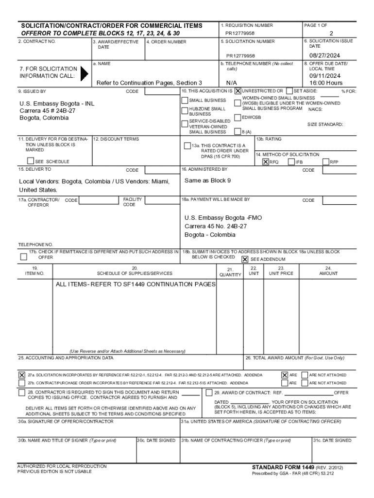 August 27, 2024.COMBINED SYNOPSIS/SOLICITATION RFQ Number PR12779958 The Bureau of International Narcotics and Law Enforcement (INL) at the U.S. Embassy in Bogota invites you to submit a quotation
