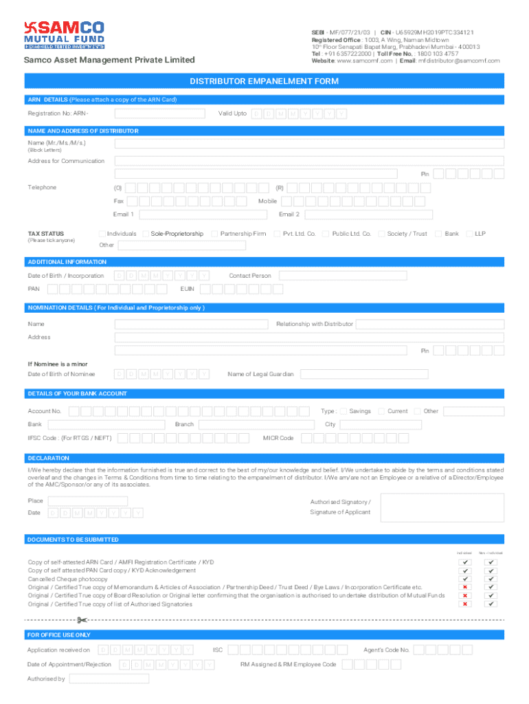 Get the free Distributor Empanelment Form - Samco Mutual Fund