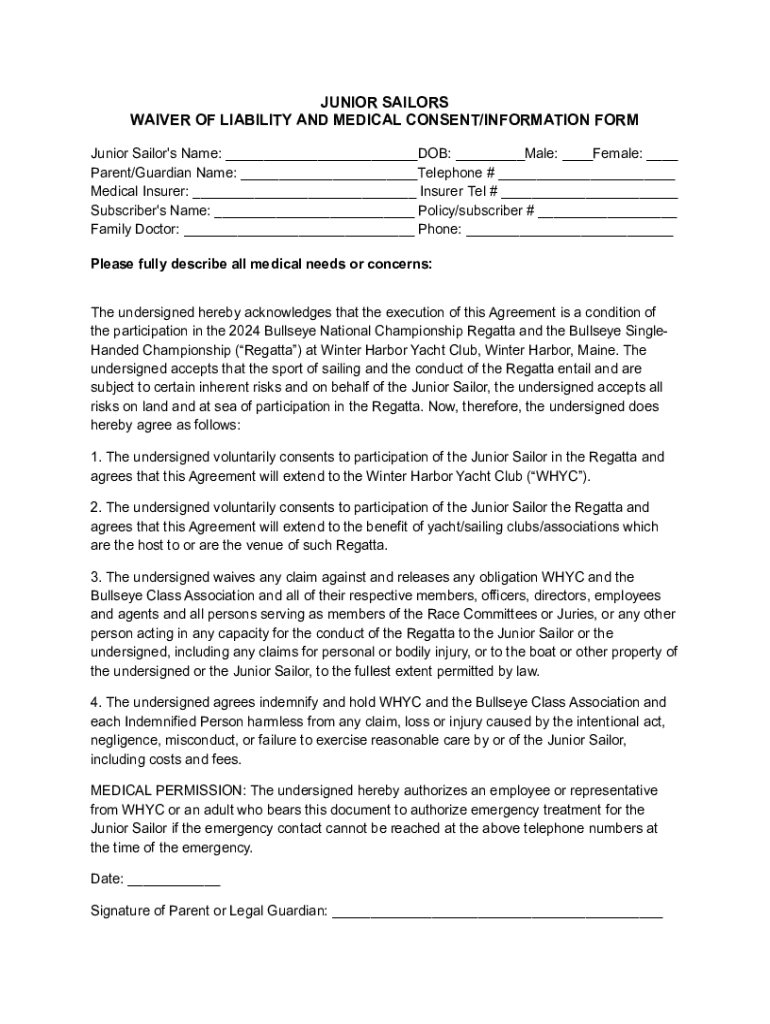 JUNIOR SAILORS WAIVER OF LIABILITY AND MEDICAL CONSENT/INFORMATION FORM Junior Sailor\'s Name: ___DOB: ___Male: ___Female: ___ Parent/Guardian Name: ___Telephone # ___ Medical Insurer: ___ Insurer